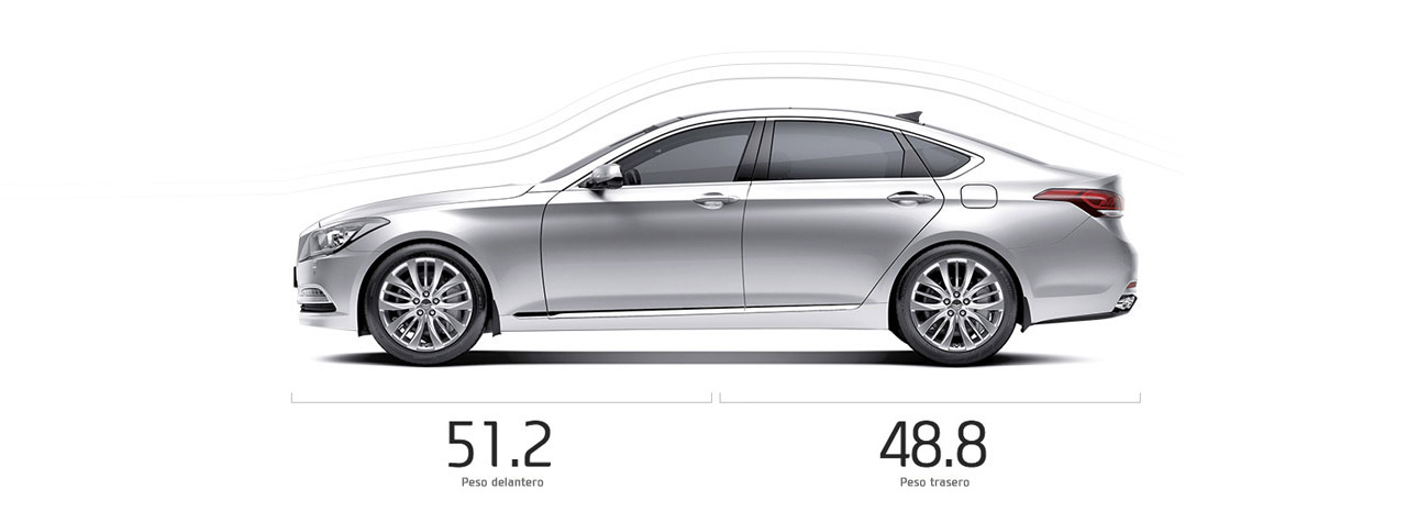 Hyundai ha logrado una distribución de peso delantero a posterior de 51.2: 48.8, una relación ideal pero extremadamente difícil de lograr, garantizándo una conducción excepcional. La distancia entre ejes se extendió con saliente reducida tanto en la parte delantera como posterior. Sin embargo, la longitud del capó delantero se incrementó para conseguir un perfil más dinámico.